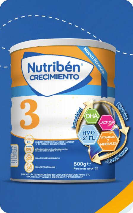 Nutribén® Crecimiento 3 cuentan con prebiótico HMO 2’FL y probióticos, que apoyan el desarrollo de una microbiota intestinal sana.